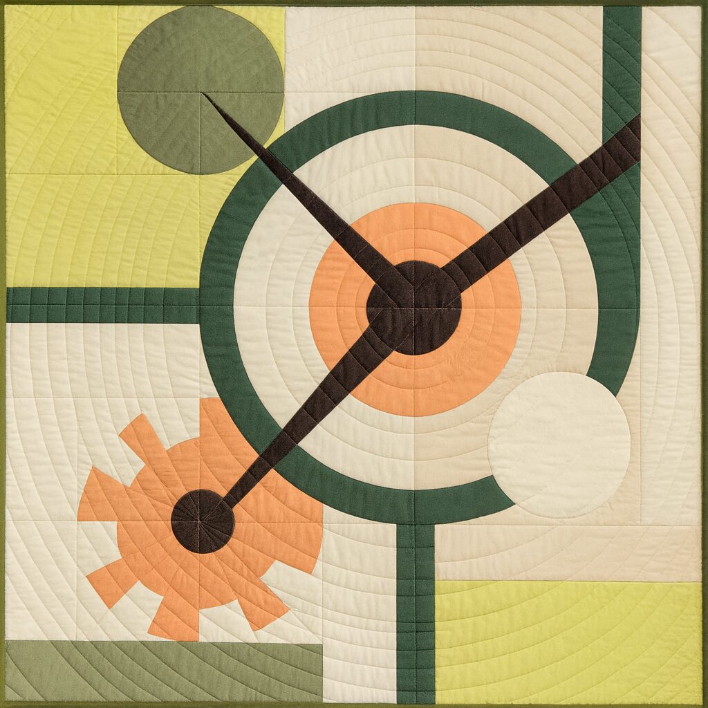 Dieser Wandquilt vereint grafische Präzision mit einer dynamischen, maschinenhaften Ästhetik. Kreise, Zahnräder und überlagerte Linien bilden ein abstraktes Zusammenspiel von Bewegung und Struktur – eine textile Interpretation von Mechanik und Zeit. Das Design erinnert an konstruktivistische Grafiken und an die formale Klarheit des Bauhauses, umgesetzt in einer modernen Quiltkomposition.